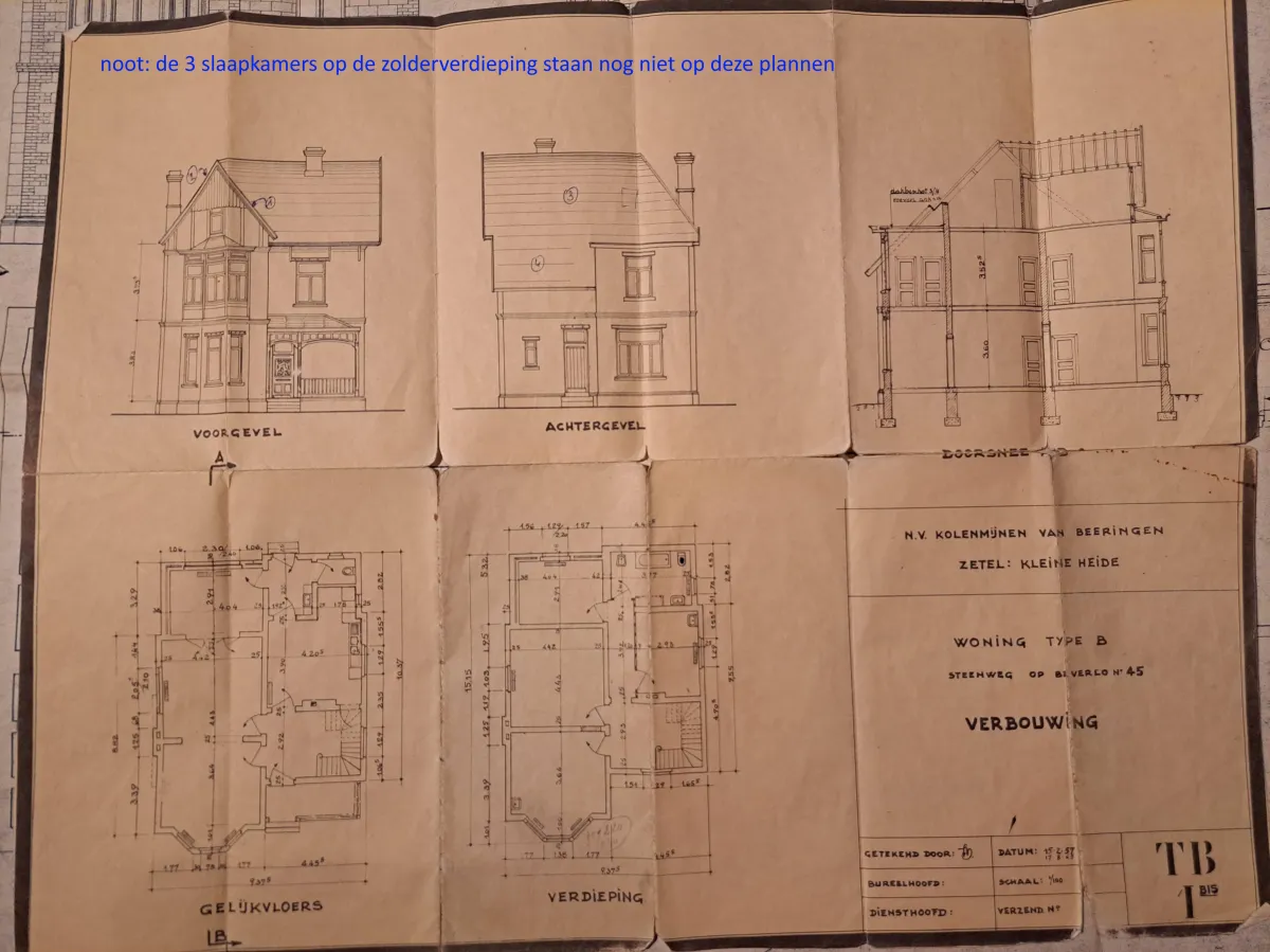 De originele bouwplannen vind je bij de foto's, maar de zolder op de 2de verdieping werd pas later verbouwd om 3 extra slaapkamers te creëren.